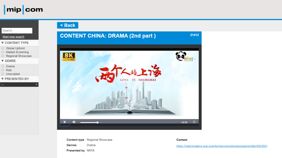 此次中国联合展台专区展示的优秀作品超过200部,包括影视作品80余部,动漫作品80余部,纪录片近20部,电视节目、综艺和原创模式等20余部。包括尚世影业出品都市题材剧《两个人的上海》,SMG重点推荐的抗疫作品《人间世之抗疫特别节目》赫然在列。