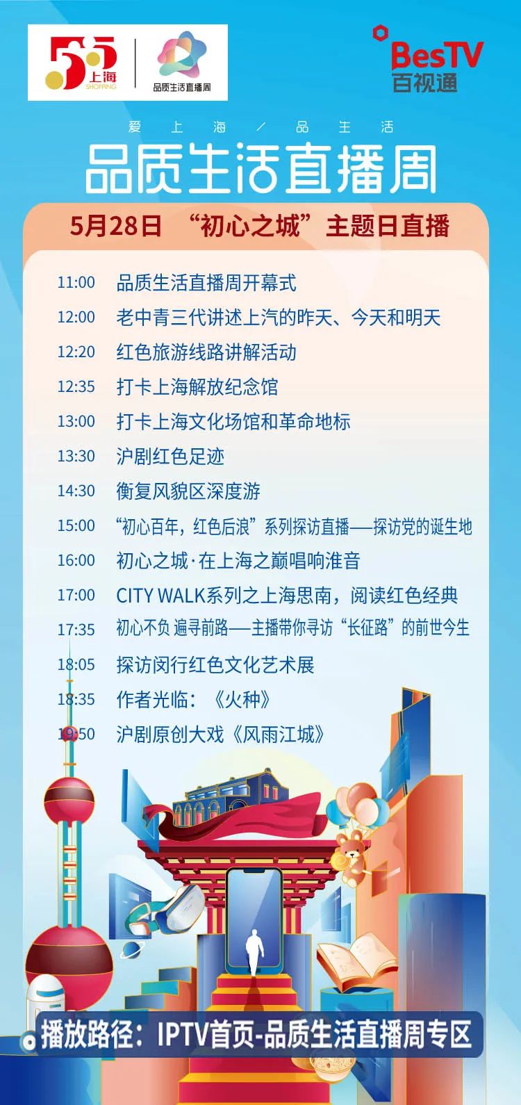 5月28日至6月3日,第二届“五五购物节·品质生活直播周”以“爱上海、品生活”为主题,通过线上直播、线下探访等方式,围绕红色文化、魅力上海和数字化转型等三大主题,将举办近500场线上线下活动,策划超过170场重点活动。东方明珠新媒体股份有限公司(东方明珠新媒体)旗下百视通作为此次直播周的承办方之一,将在IPTV端设立“品质生活直播周”专区,全程直播活动开闭幕式,并全天候滚动播出直播周精彩内容;东方购物作为重点参与企业,将甄选多款口碑商品,推出多项精彩纷呈的直播活动。东方明珠新媒体将以多元文化体验和优质商品,助力解锁城市品质生活的幸福密码。