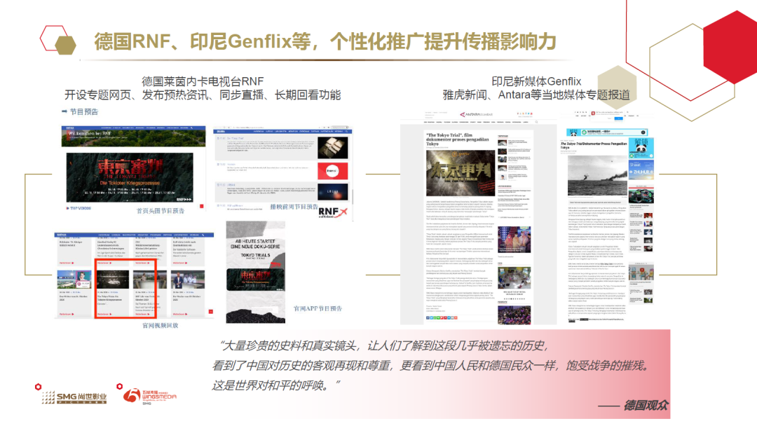 以SMG大型纪录片《东京审判》为例,尚世、五岸参与了德、俄、希腊语、印尼语等多语种译制、发行和海外推广全过程,并制定了个性化译制和宣推方案。比如,在德国RNF电视台黄金时段开播德语版的同时,其官方网站还开设专题网页,同步直播并长时间保留影片,在海外实现“台网播出”。此次成功海推令《东京审判》落地多国主流电视平台和新媒体平台,产生广泛的国际影响。