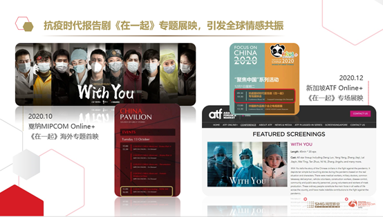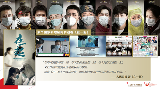 抗疫题材时代报告剧《在一起》,在海外十几个国家播出并在戛纳MIPCOM、新加披ATF进行了专题展映活动,为海外提供了抗疫经验,传递了疫情下坚定不移的信念和力量。