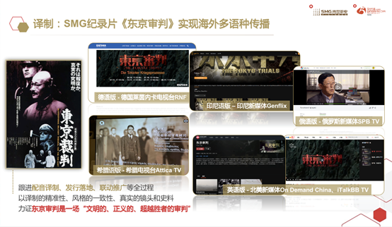 尚世五岸参与了SMG出品大型纪录片《东京审判》的多语种译制、发行和海外推广全过程,包含德、俄、希腊语、印尼语等。同时制定了个性化译制和宣推方案,如:德语版在电视台黄金时段开播的同时,尚世五岸在其官方网站开设了专题网页,同步直播并长时间保留影片,在海外实现了“台网播出”,产生了广泛的国际影响。