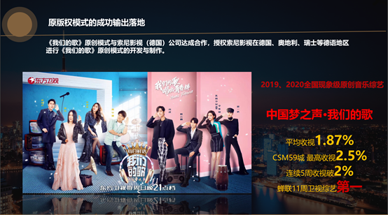 五岸传播与索尼影视德国公司(Sony pictures Entertainment)签署了节目模式授权协议,授权在德国,奥地利,瑞士等的德语地区进行《我们的歌》德语版的发行、制作。将SMG原创内容模式成功输出,展现了“中国制造”综艺栏目的国际化进步。