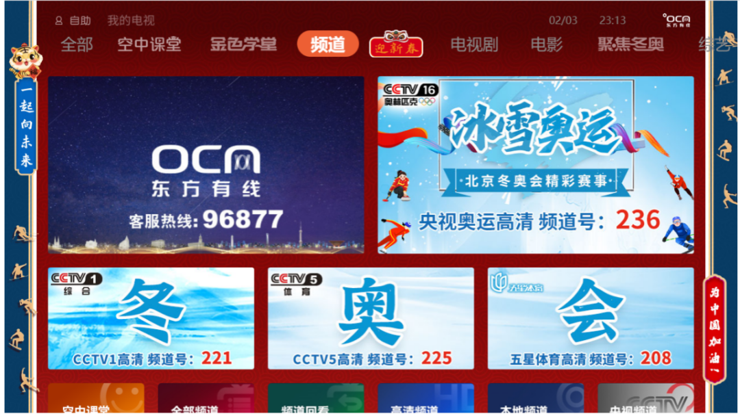 冬奥期间,东方有线频道首页推荐来自央视奥运频道、央视一套、央视体育以及五星体育频道的冬奥会节目转播。“空中课堂”推出冬奥特别策划介绍冰壶魅力,打造全面呈现冬奥资讯及特别节目的专区。