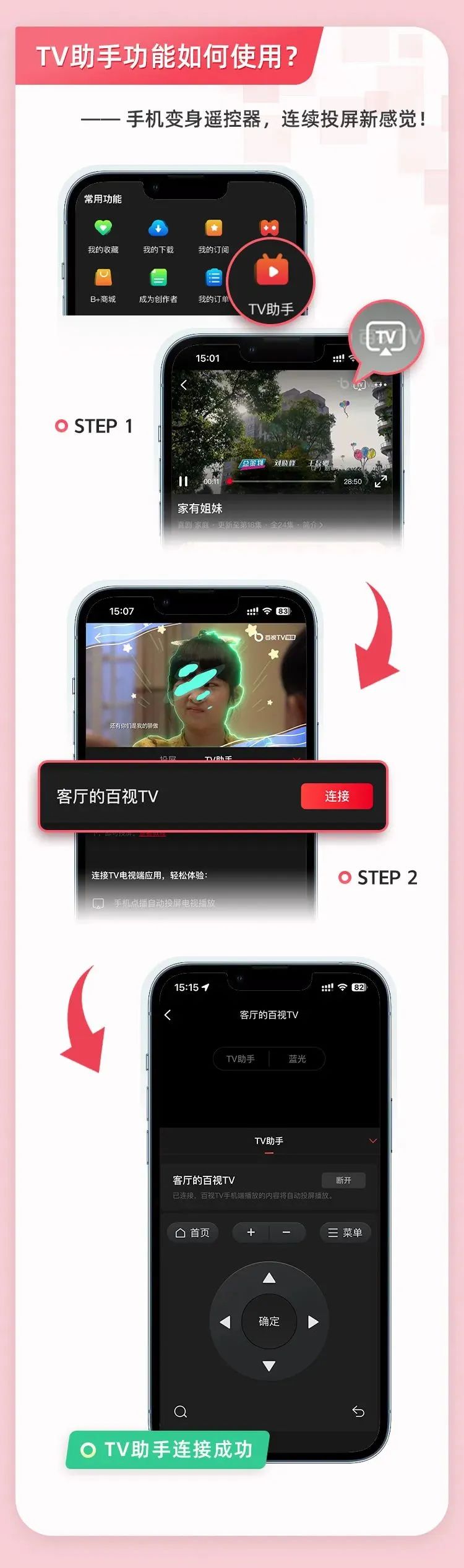 通过此次版本升级,广大百视TV用户不仅能体验手机、电视双APP联动的全新投屏功能,更可让手机变身为电视大屏的“可视化遥控器”,感受云投屏播放、TV助手等创新功能。双屏联动功能的推出,既实现了真正意义上的大小屏业务联动,又为更进一步深度融合奠定了基础。
