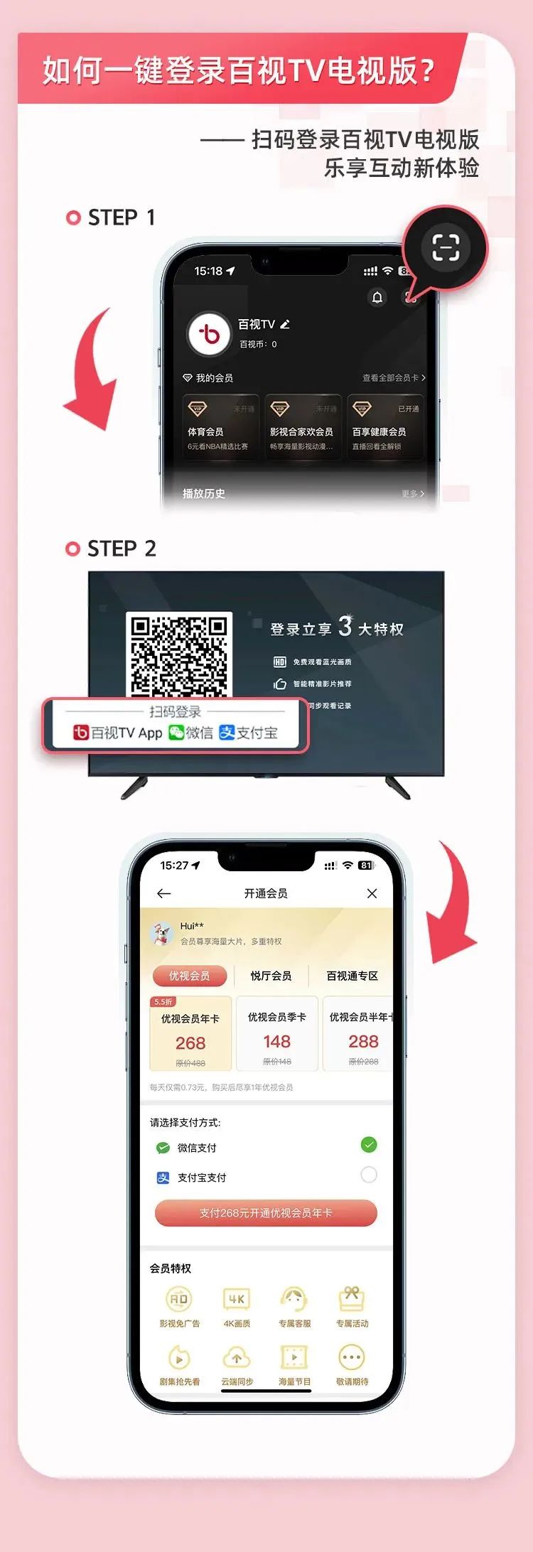 电视版现已支持百视TV手机APP扫码登录啦!进入【我的】-【扫一扫】,扫描电视版登录二维码即可登录成功。此外,在投屏成功之后,也可以根据提示一键登录电视版哦。