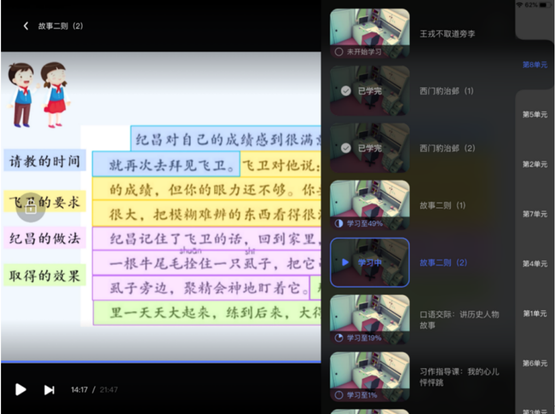 第三步:点击科目,进入科目学习页面,课程结构与学生书本教材顺序一致。