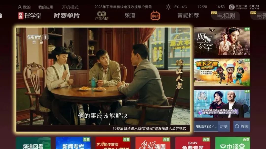丰富内容供给方面,东方有线于2023年9月推出了“重温经典”免费点播专区,汇聚来自上影厂、上海美影厂等的经典作品,为用户奉上富有鲜明海派特色和怀旧风格的优质影视内容。百视通升级后的免费专区节目量达10万小时,专区首行显著位置不断更新推荐当周精彩“限免”内容。用户可通过分类入口筛选查找喜爱的免费节目,百视通自主研发的智能推荐系统还将根据用户收视喜好展示推荐相关内容。