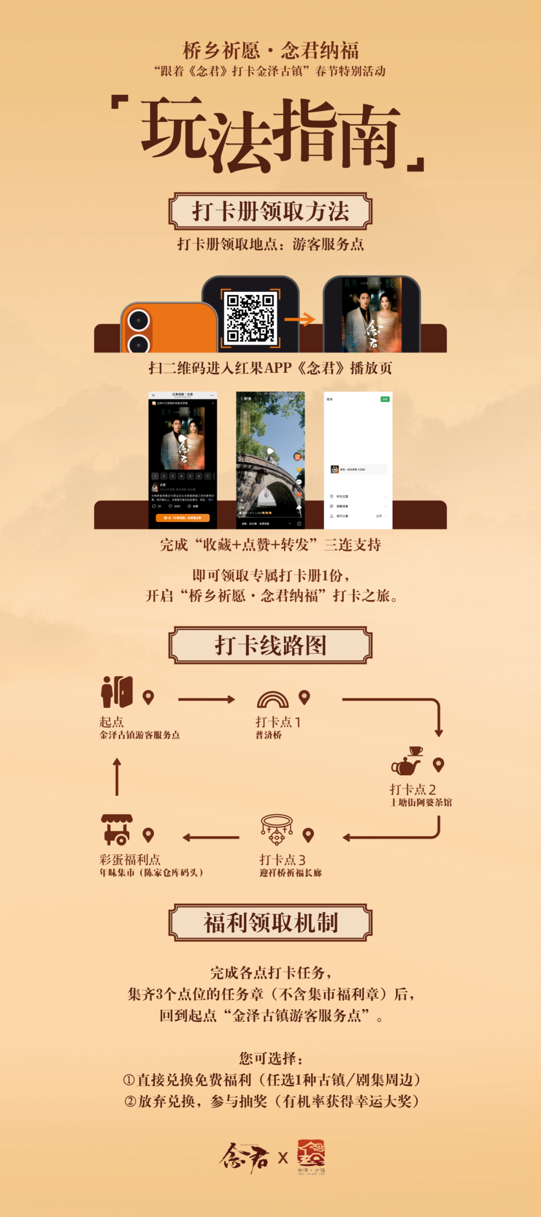 集齐3个任务章,即可兑换《念君》限定周边,或参与抽奖,赢取金泽古镇文创大奖!