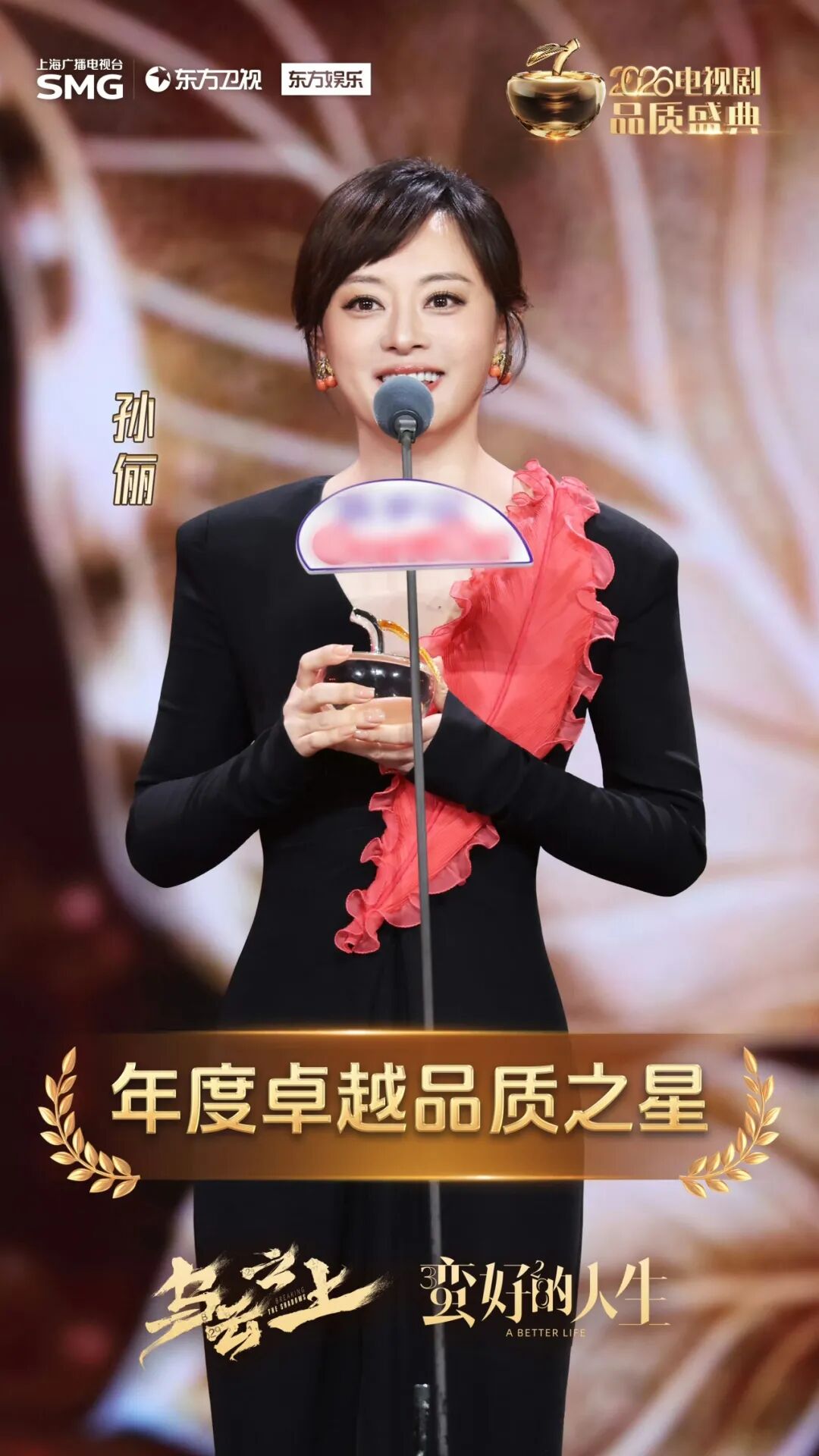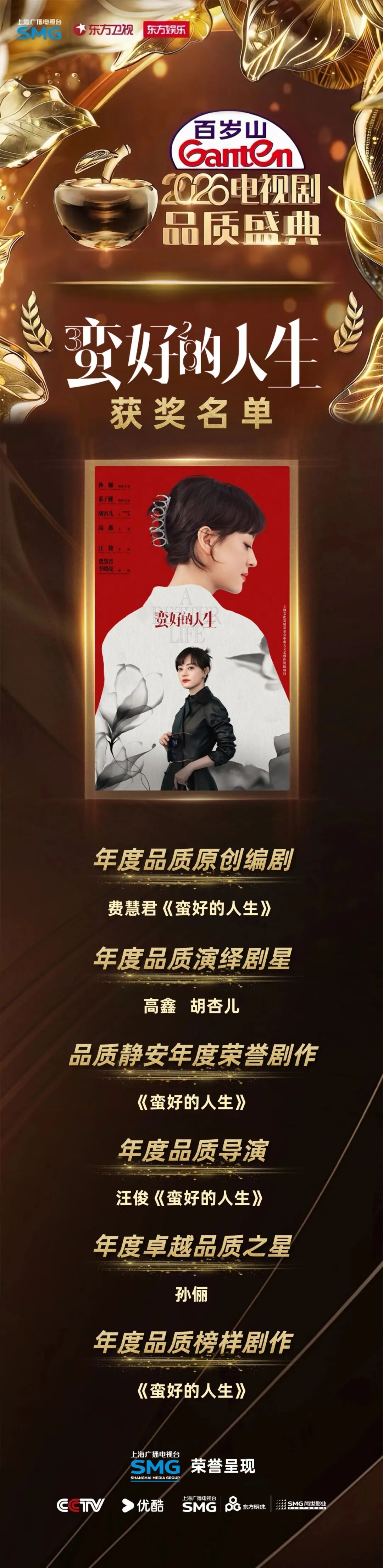 剧耀东方 2026电视剧品质盛典 星光聚首,品质铸魂!昨晚,2026上海影视创制大会系列活动——《剧耀东方•2026电视剧品质盛典》在东方卫视播出。各大剧组主创齐聚现场,共赴荣耀之约,摘得属于他们的“品质之果”。 由上海广播电视台荣誉呈现,中央电视台、东方明珠旗下尚世影业、优酷联合出品的都市民生话题剧《蛮好的人生》大放异彩,一举斩获“年度品质榜样剧作”“品质静安年度荣誉剧作”两大重磅剧集奖项,同时包揽“年度卓越品质之星(孙俪)”“年度品质演绎剧星(胡杏儿、高鑫)”“年度品质导演(汪俊)”“年度品质原创编剧(费慧君)”五项主创荣誉,以7项大奖的亮眼成绩,成为本届盛典当之无愧的品质赢家与剧集标杆。